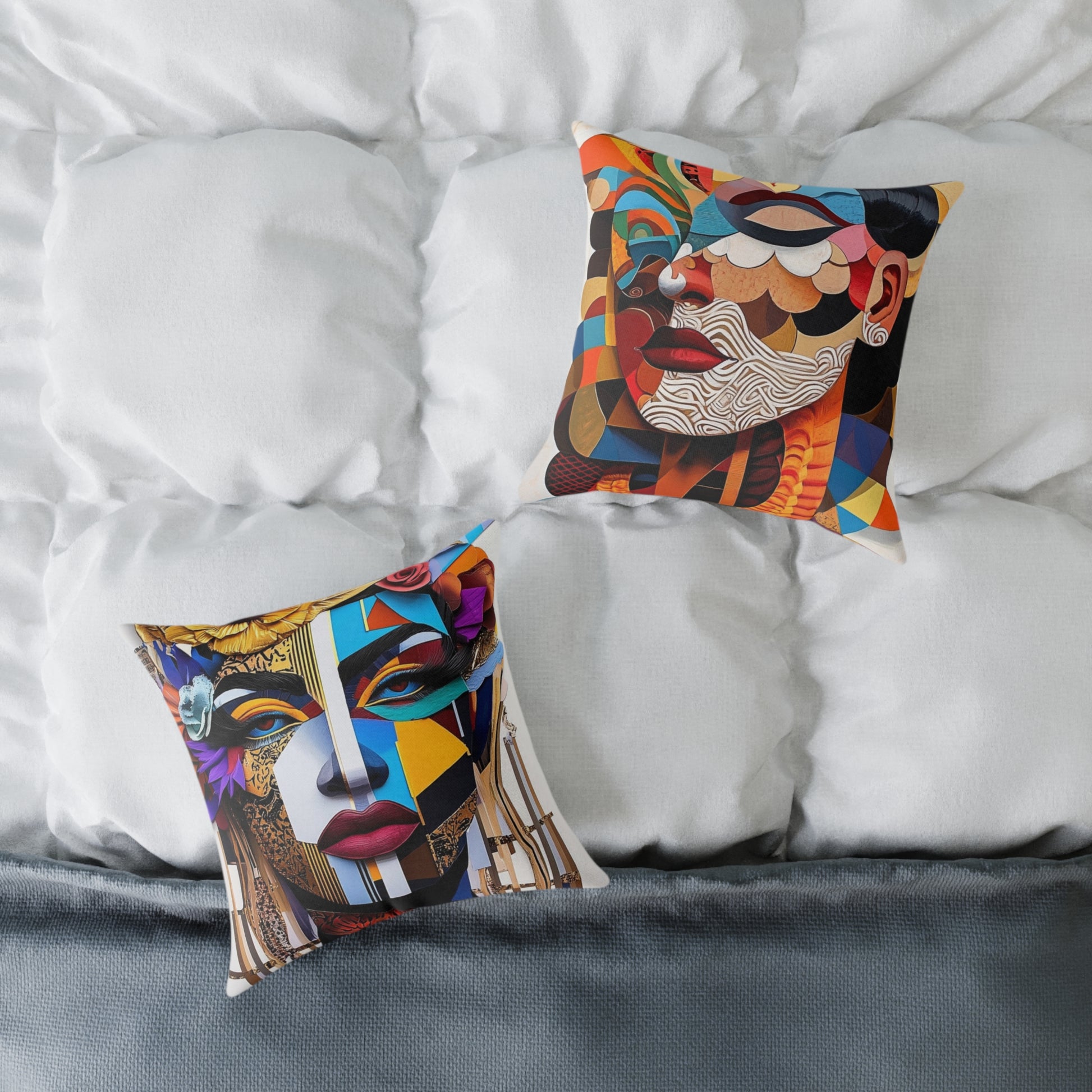 Bold, art-forward throw pillow that brings gallery energy to everyday spaces. The richly colored, double-sided canvas showcases layered, abstract portraits—faces built from geometric shapes and textured patterns—so the pillow reads as a statement piece whether it lives on a sofa, bedroom chair, or floor. The dense polyester fill keeps the shape plump for lounging and low-maintenance living, while the concealed zipper lets you remove the cover when you want to freshen the look. Choose from five sizes to fit cozy nooks or dramatic seating arrangements. This pillow speaks to anyone who collects color, texture, and modern portraiture and wants their home to feel curated and alive.